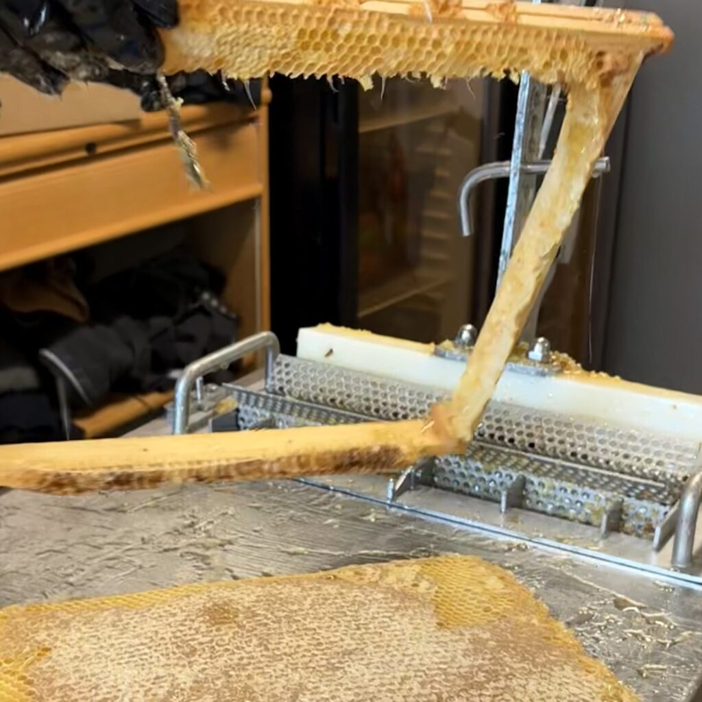 The wax is cut off, and the frames go into a machine that squeezes and strains the honey